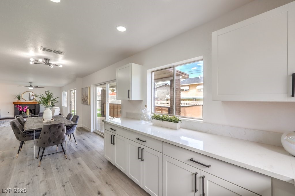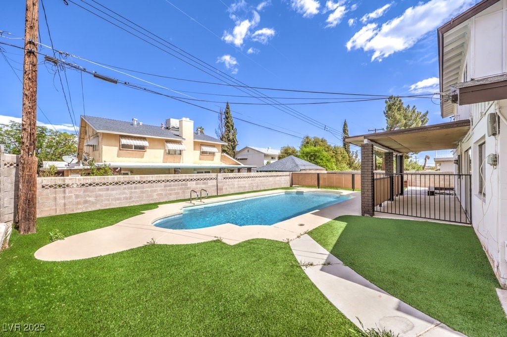 2700 sq. ft. turnkey masterpiece offers top-of-the-line finishes & rare NO HOA opportunity in a prime central location, just minutes from Downtown Las Vegas & the Strip. With 6 bedrooms this fully renovated two-story home blends modern luxury w/comfort, making it ideal for both living & entertaining. A wide covered front porch & manicured lawn create stunning curb appeal, welcoming you inside to a spacious open-concept layout. Natural light floods through large windows & dual sliding doors, enhancing the seamless indoor-outdoor flow. A cozy fireplace at the end of the living room adds warmth & charm, making this home inviting. Designed for convenience & privacy, the primary suite is located on the main floor, while a second primary suite on the upper level features direct access to a front-facing balcony. Step outside to a generous backyard oasis w/a large rear lawn & complete w/sparkling pool, covered patio, & RV parking.